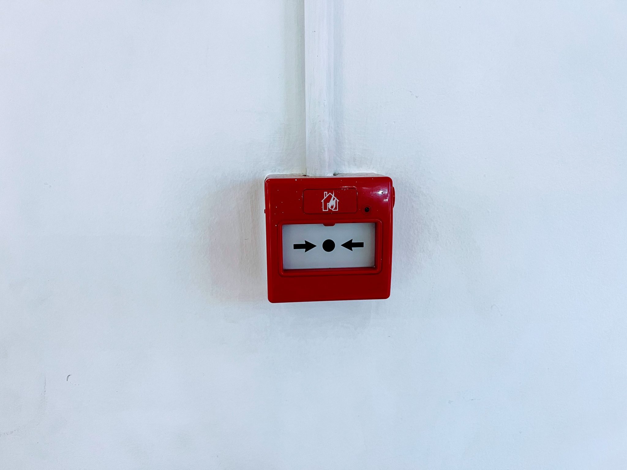 A red square fire alarm call point is mounted on a plain white wall, with a white wire running vertically above it.” by Alina Kakshapati/ CC0 1.0
